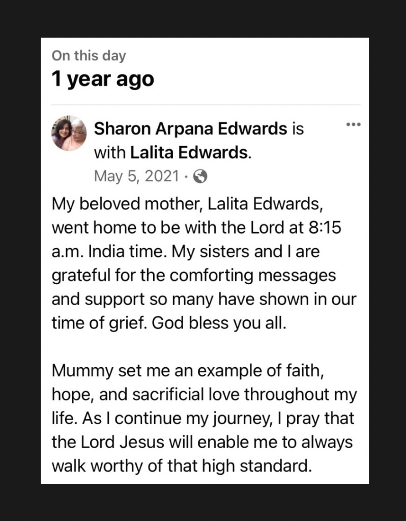 Writing the eulogy for Lalita Edwards is at once easy and difficult. Easy because of her exemplary character and well-lived life, and difficult because she was my mother and this is yet another reminder that I will not see her again this side of eternity. There’s a reason the Bible describes death as the last enemy.