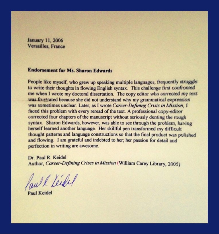“In 2004 I approached Sharon Edwards to edit my first book, Searching for the Indigenous Church, which was subsequently published by William Carey Library in 2005. It was a very positive experience working closely with her and the final manuscript was certainly better as the result of it. Sharon has an eye for good prose and the ability to push an author to write to that end, yet all the while remaining respectful of their opinions. I consider her a fine editor and would be pleased to work with her again.”